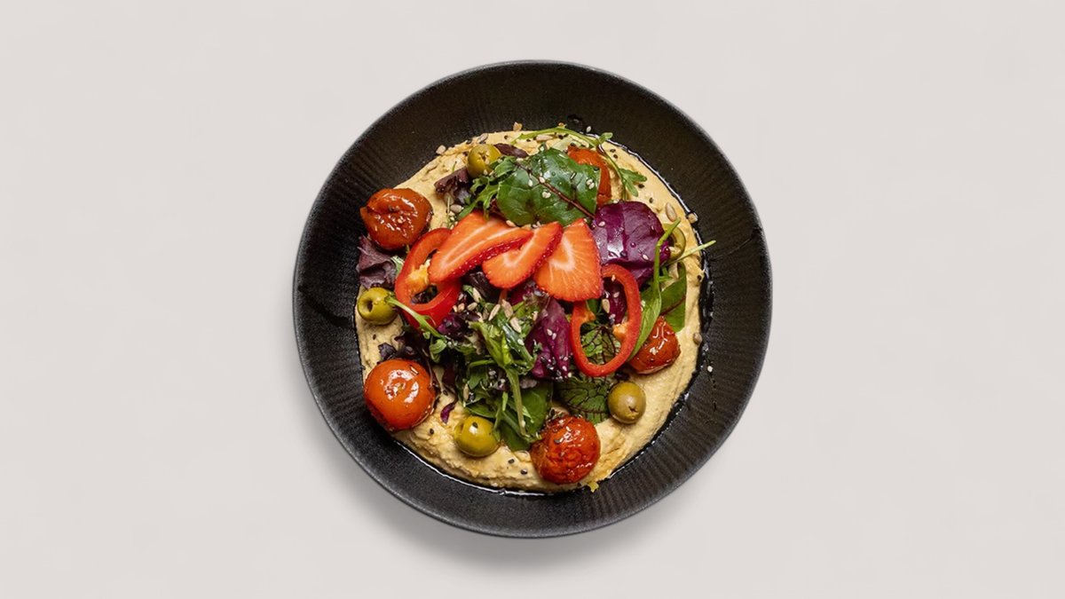 mit hausgemachtem Hummus, frischem Salat, gerösteten Tomaten, Oliven und Brot, verfeinert mit frischen Früchten, Sonnenblumenkernen und Zitronenöl