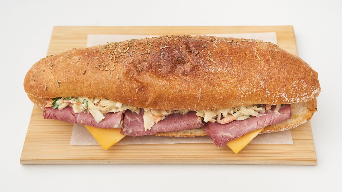 with honey mustard, homemade coleslaw, Cheddar cheese and beef pastrami