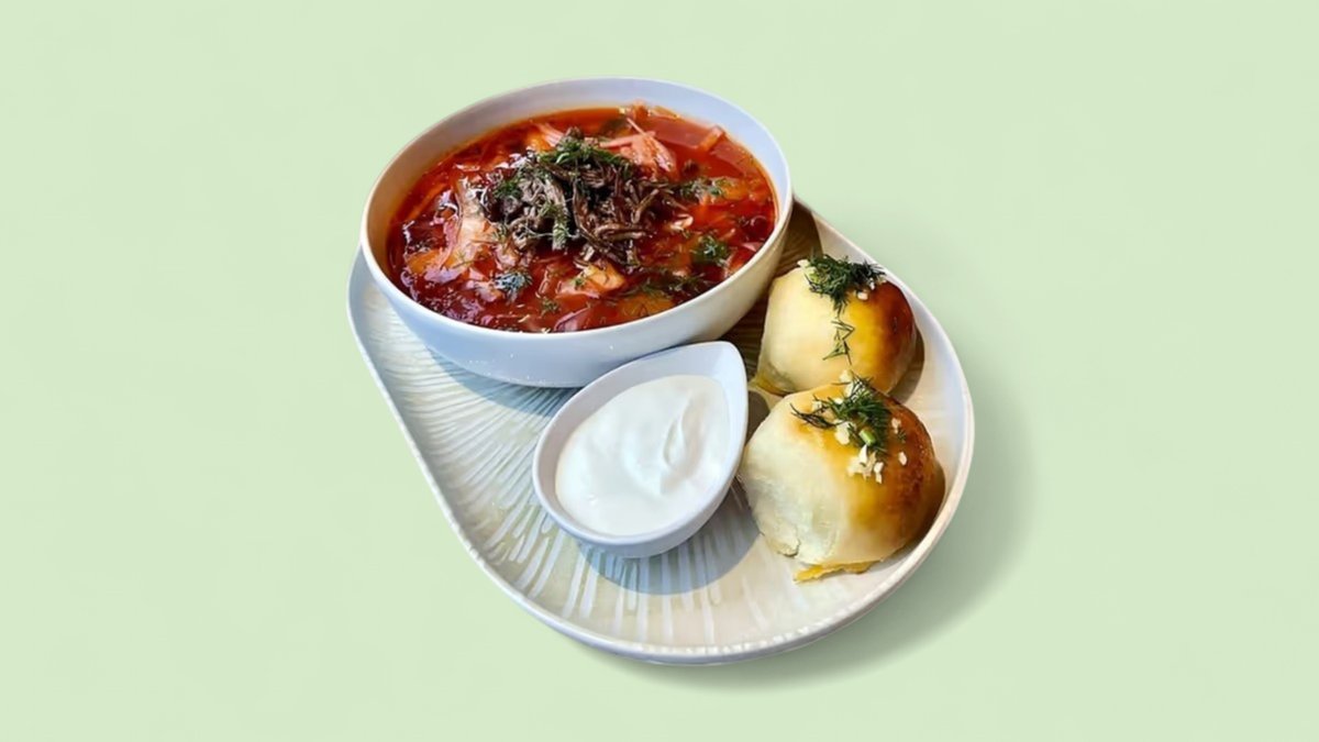 Hausgemachter Borschtsch mit zarten, langsam geschmorten Kalbfleischstücken, serviert mit frischen, fluffigen Pampuschki, verfeinert mit Knoblauch und Dill, dazu ein Klecks cremiger Sauerrahm. Herzhaft, aromatisch und wohltuend – wie aus der heimischen Küche.