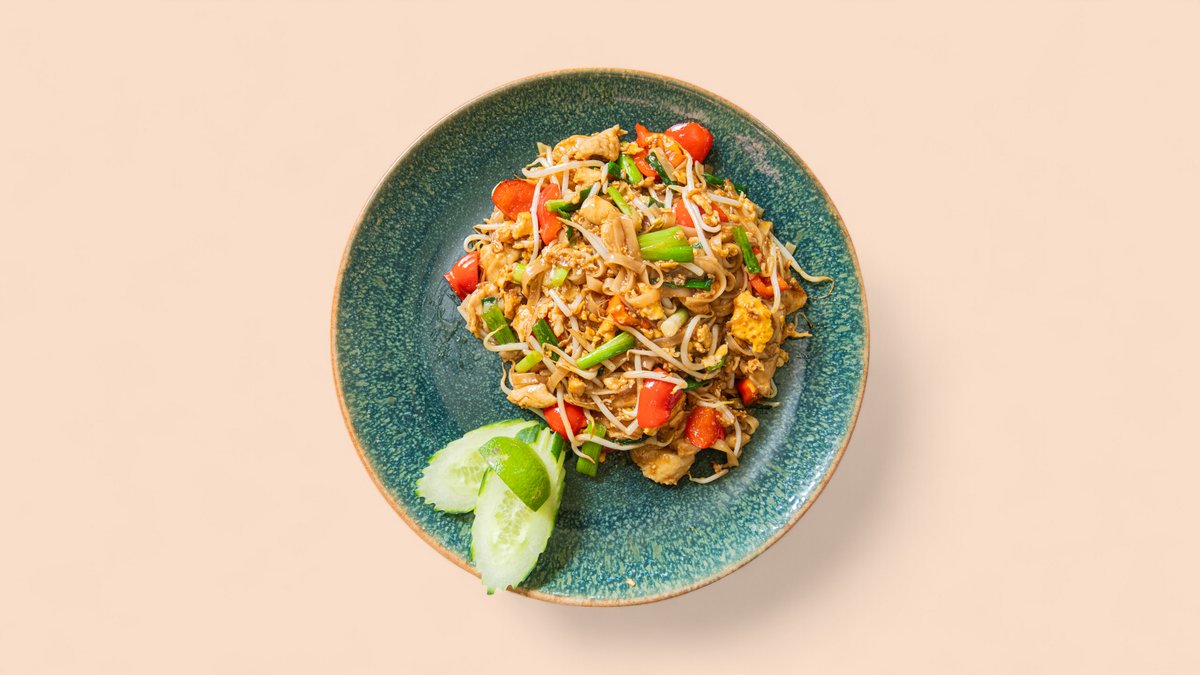 gebratene Reisbandnudeln mit Hühnerbrust, rotem Curry und thailändischem Gemüse