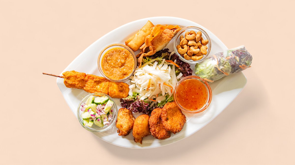 in einer Größe deiner Wahl mit Satespieß, 2x Frühlingsrollen, 2x Wantan, 2x Tempura Ebi, 1x Sommerrolle, 2x Hühnerfleischbuletten, Erdnusssoße und süß-scharfer Chilidip
