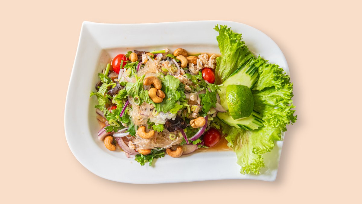 scharf Glasnudelsalat mit Hühnerbrust, Cashewnüssen, Chili, Koriander und Zwiebeln