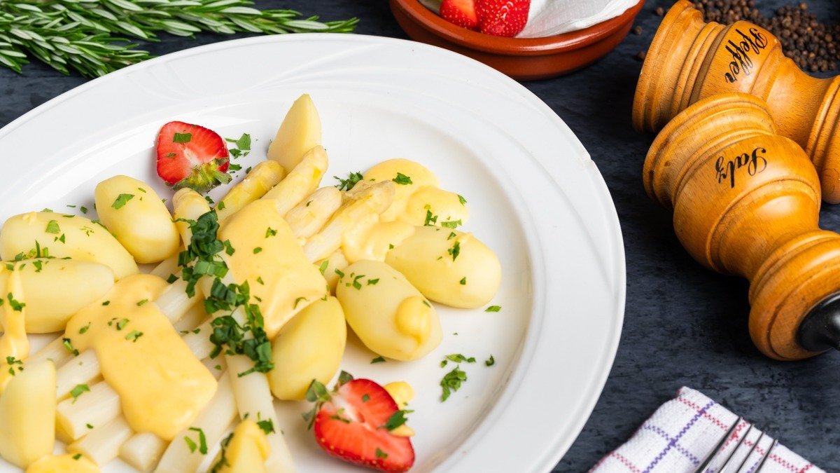 veal schnitzel with lukewarm potato salad and cranberries, served with a salad
