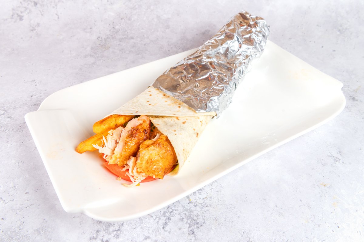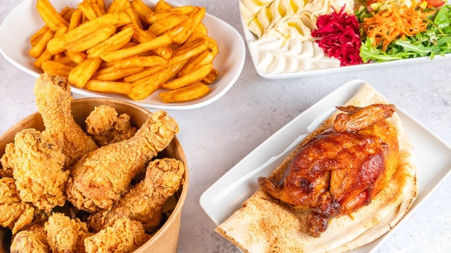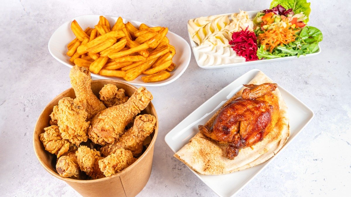 3 crispy pieces, 3 drumsticks, 5 wings and chicken with French fries, creamy hummus, garlic sauce and fresh coleslaw