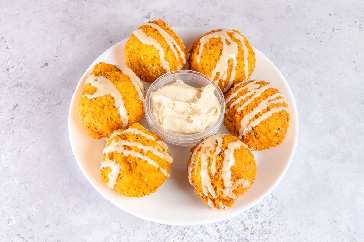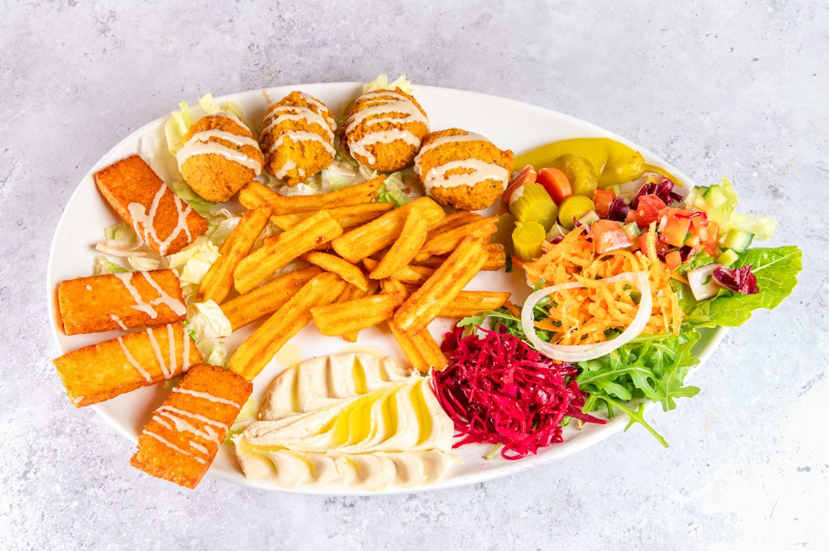 falafel and fried halloumi with hummus, sesame paste and potato slices