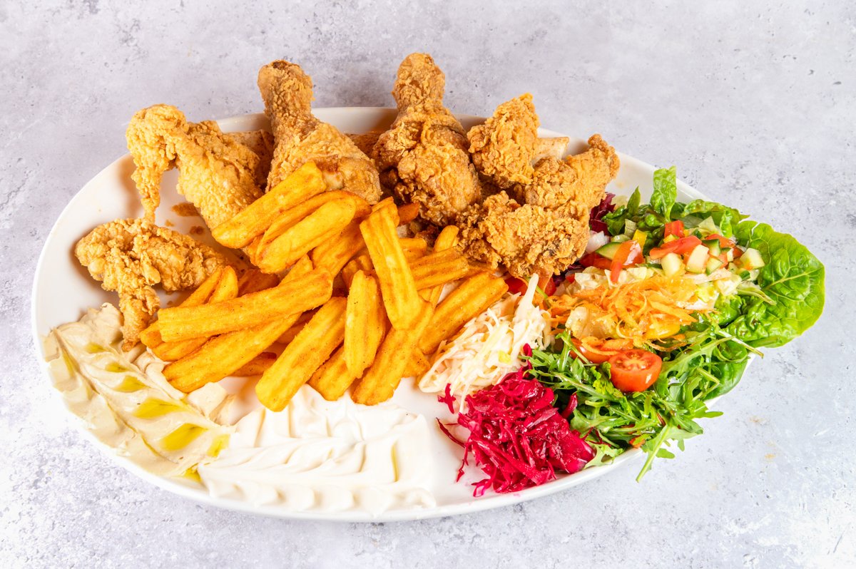 5 crispy pieces, 5 drumsticks, 8 wings and a whole chicken with French fries, hummus, 2 garlic sauces and fresh coleslaw