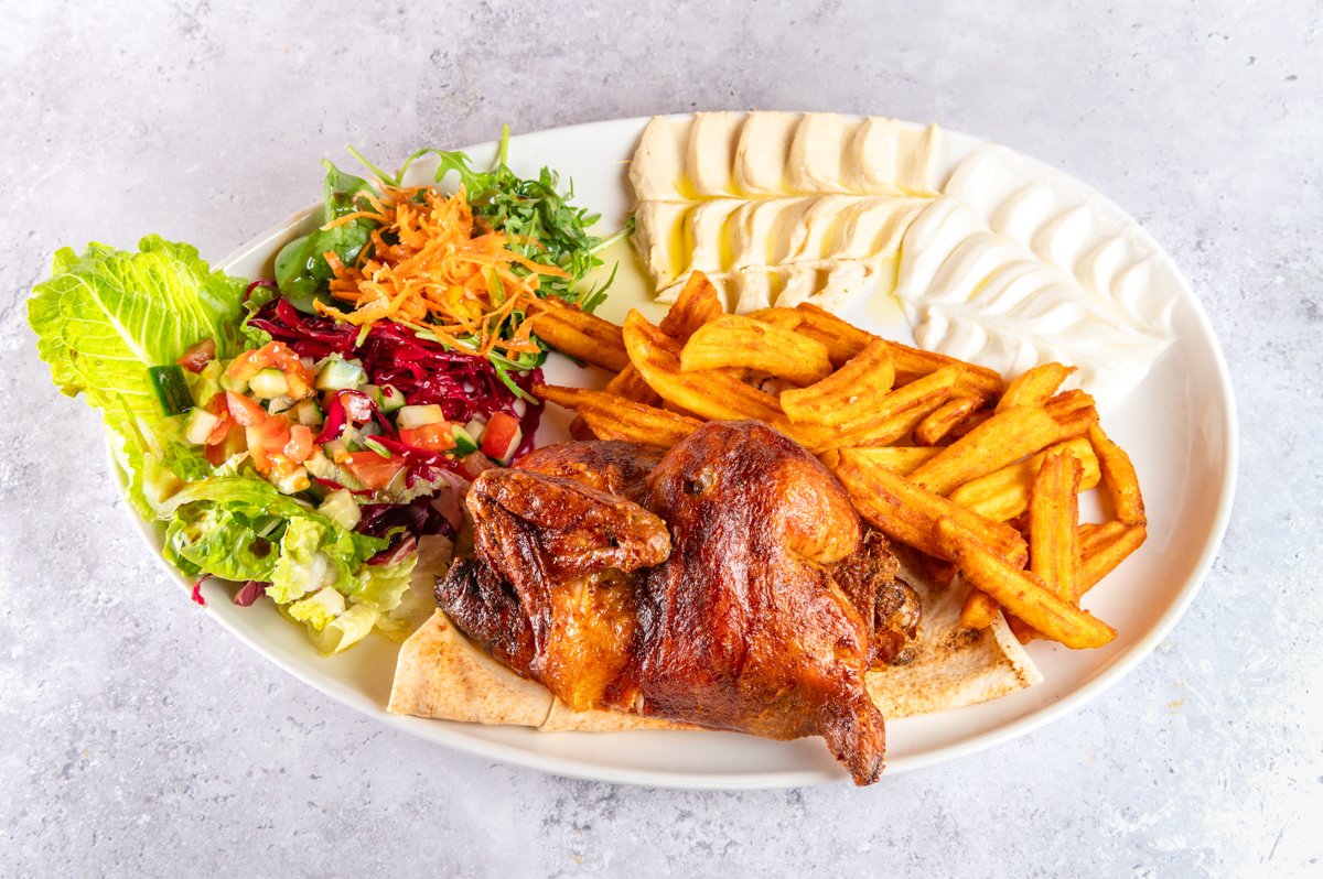 half a grilled chicken in a special marinade with French fries, hummus, fresh salad and garlic sauce