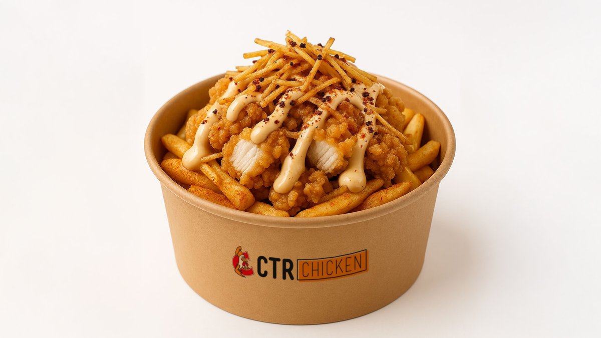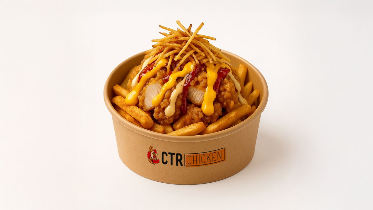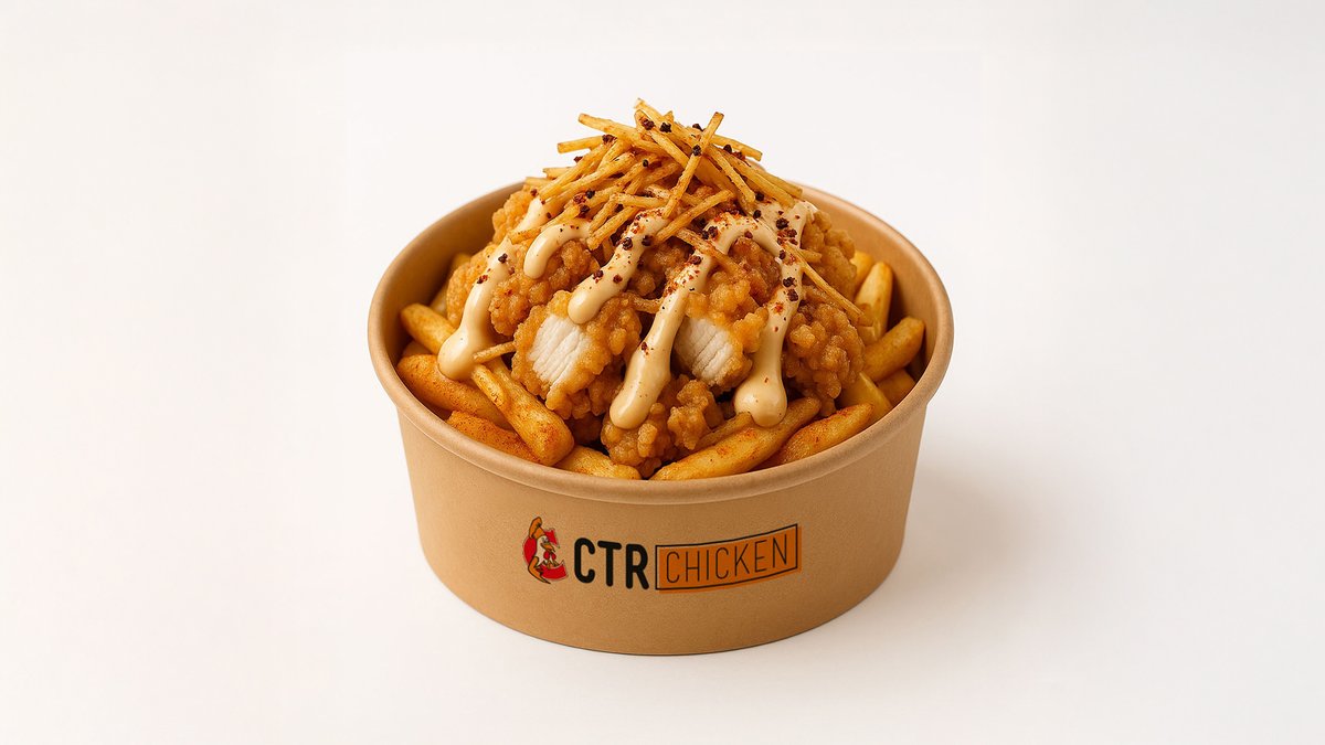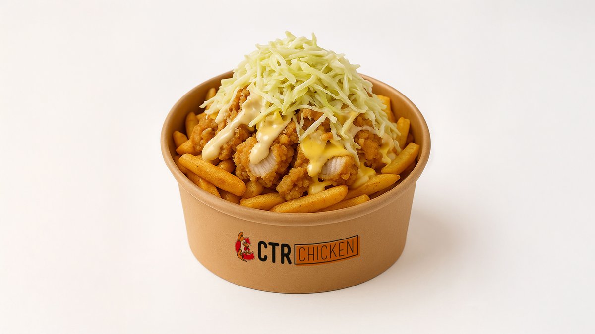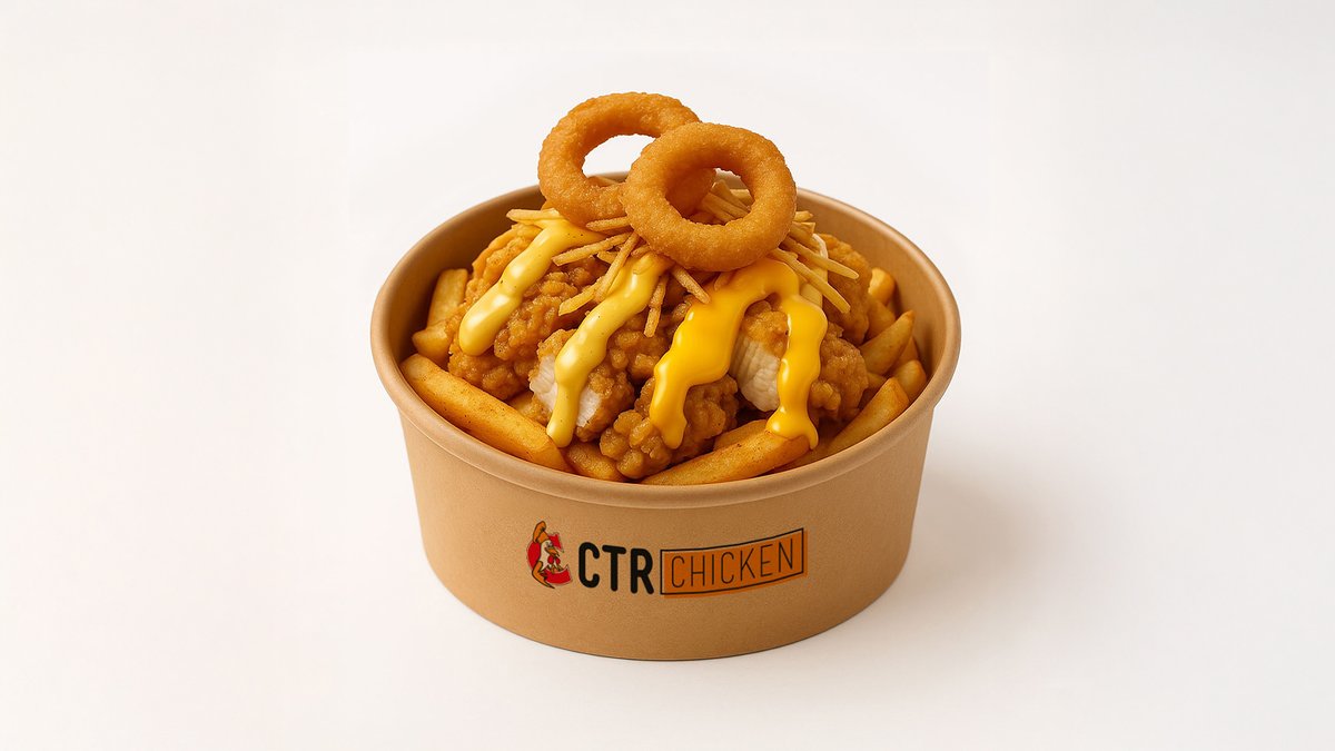 Knusprige Chicken Tenders auf Pommes, mit CTR-Haussoße und fein gewürzten Paprikageschmack getoppt mit Crunchy Raspel-Kartoffeln. Unser Klassiker für den vollen Geschmack!