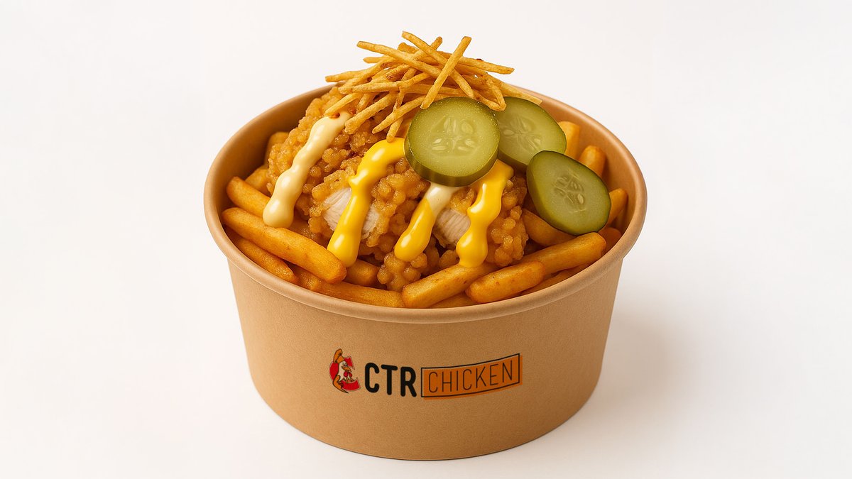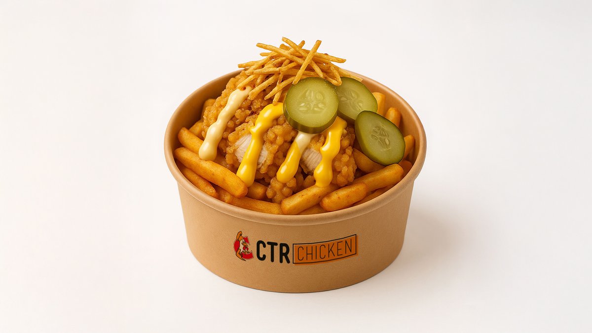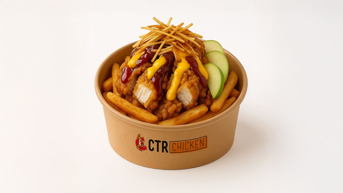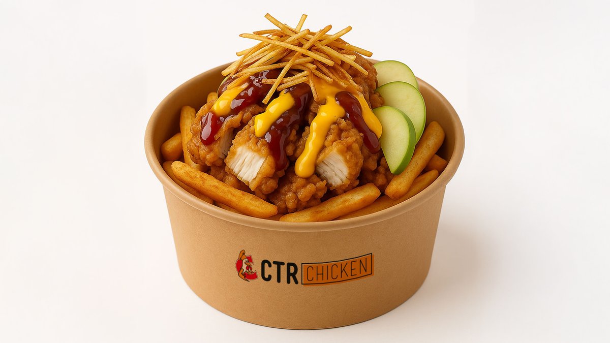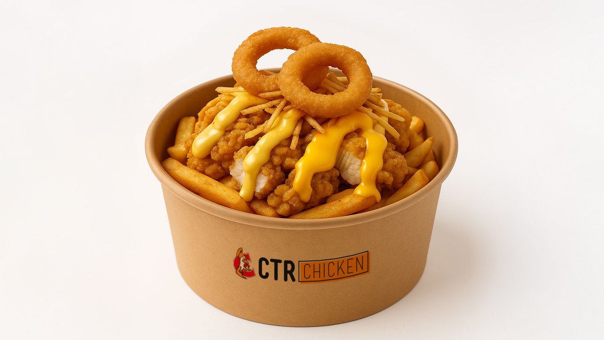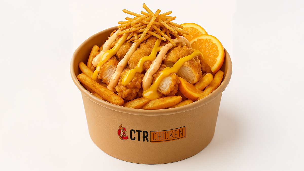 Knusprige Chicken Tenders auf Pommes, mit CTR-Haussoße und fein gewürzten Paprikageschmack getoppt mit Crunchy Raspel-Kartoffeln. Unser Klassiker für den vollen Geschmack!