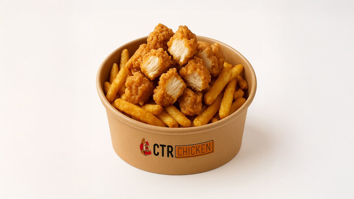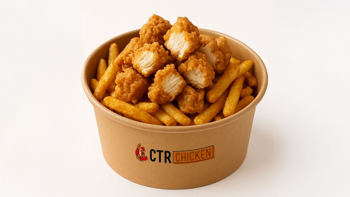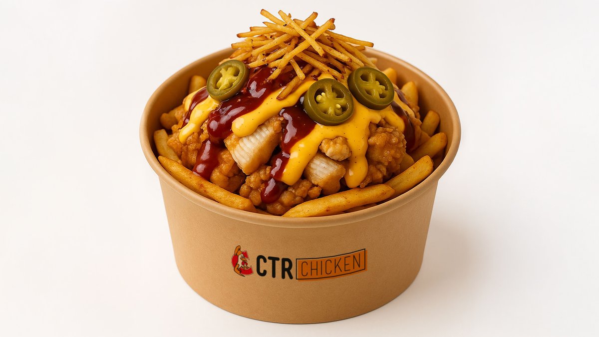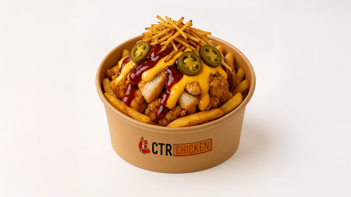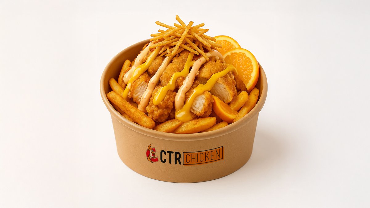 Knusprige Chicken Tenders auf Pommes, mit CTR-Haussoße und fein gewürzten Paprikageschmack getoppt mit Crunchy Raspel-Kartoffeln. Unser Klassiker für den vollen Geschmack!
