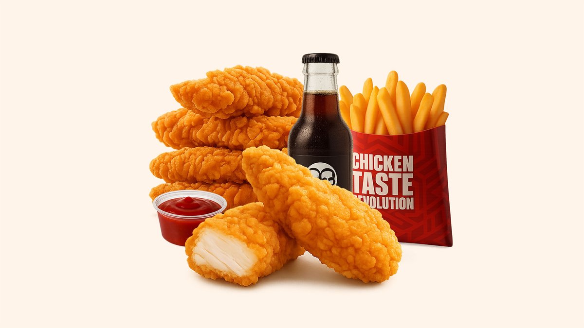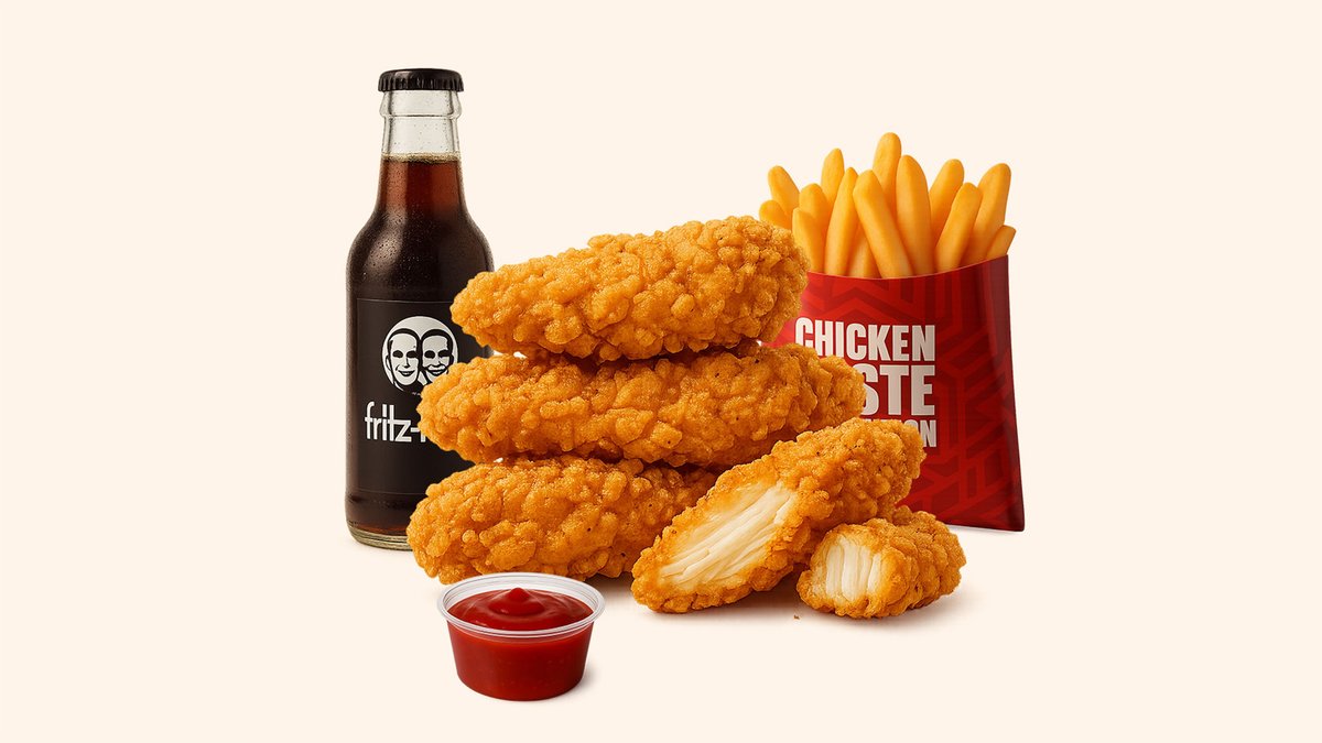 4x knuspriger Tenders 1x Pommes frites 1x Soße deiner Wahl 1x 0,2 l alkoholfreies Getränk deiner Wahl
