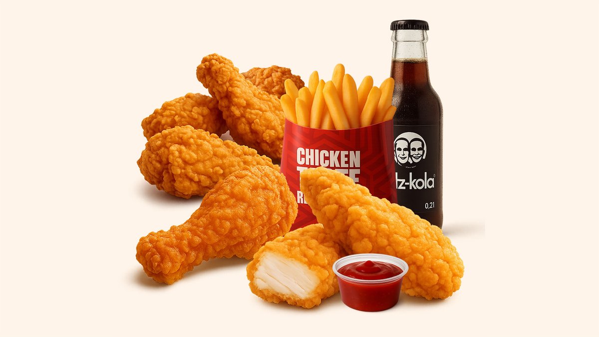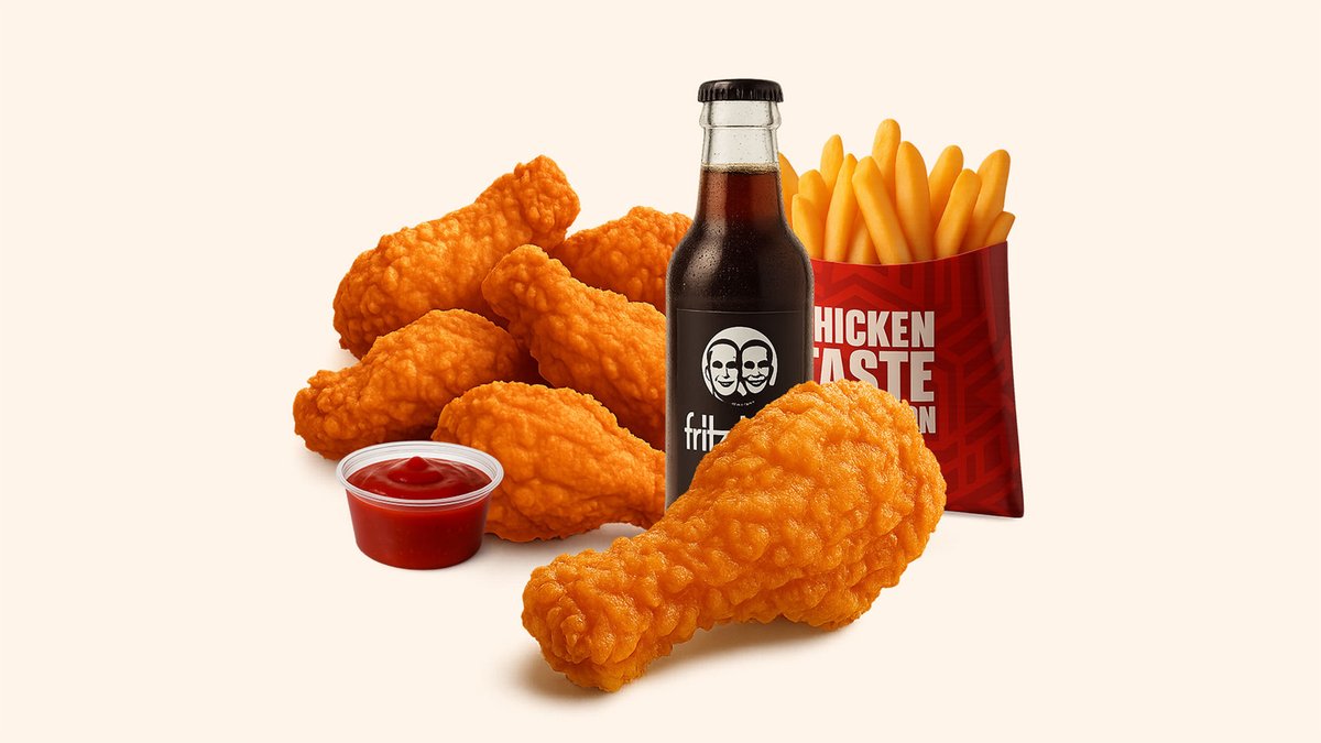 5x knusprige Chicken Wings 2x knusprige Tenders 1x Pommes frites 1x Soße deiner Wahl 1x 0,2 l alkoholfreies Getränk deiner Wahl