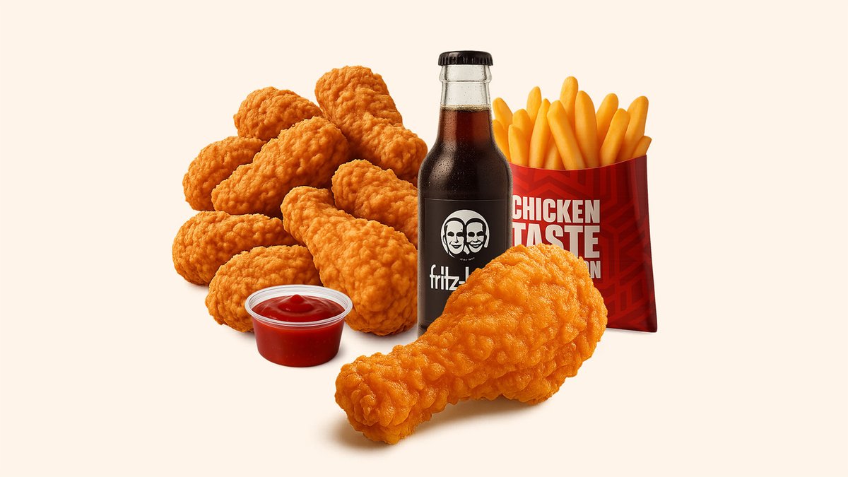 6x Chicken Tenders 1x Pommes frites 1x Soße deiner Wahl 1x 0,2 l alkoholfreies Getränk deiner Wahl
