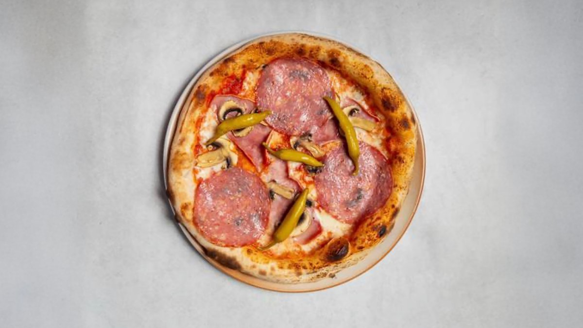 with tomato sauce, mozzarella, salami Milano, boiled ham, fresh mushrooms and green pepper