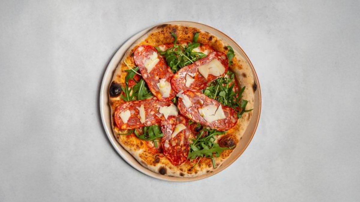 with tomato sauce, mozzarella, Spianata piccante (spicy salami), Primo Sale al Peperoncino (young sheep's cheese with chilli), rocket and truffle oil