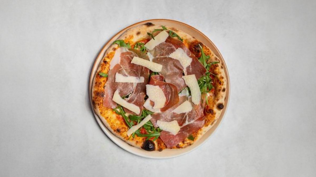 with tomato sauce, mozzarella, Parma ham D.O.P., aged for 18 months, rocket and parmesan shavings