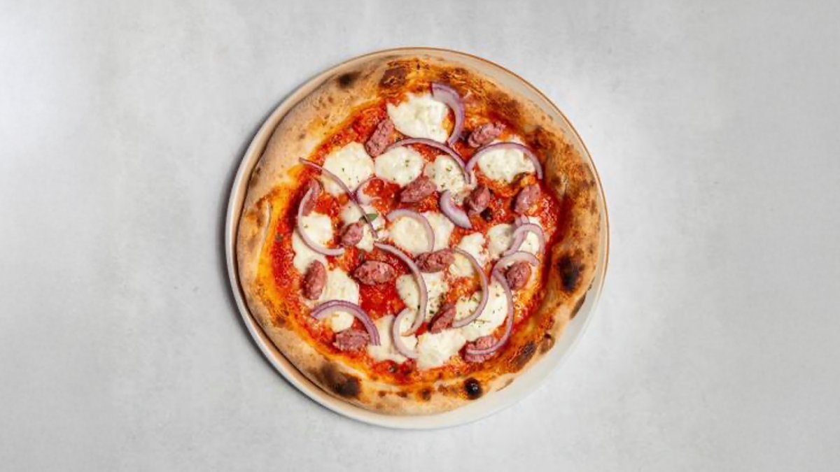 with tomato sauce, buffalo mozzarella D.O.P., fresh salsiccia (Italian sausage) and red onions