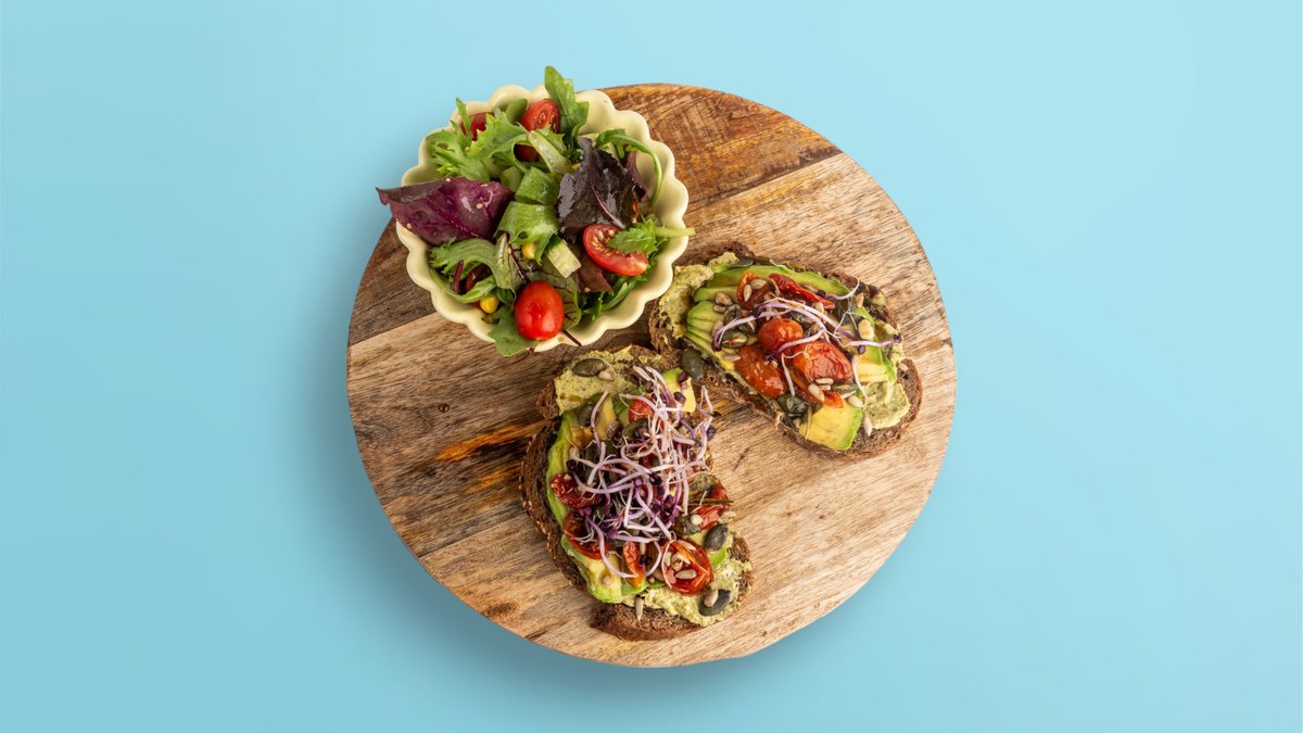 1 Scheibe Sauerteigbrot, Hummus, Avocado, gebratene Pilze, Sprossen, Granatapfelsauße und Salatbeilage