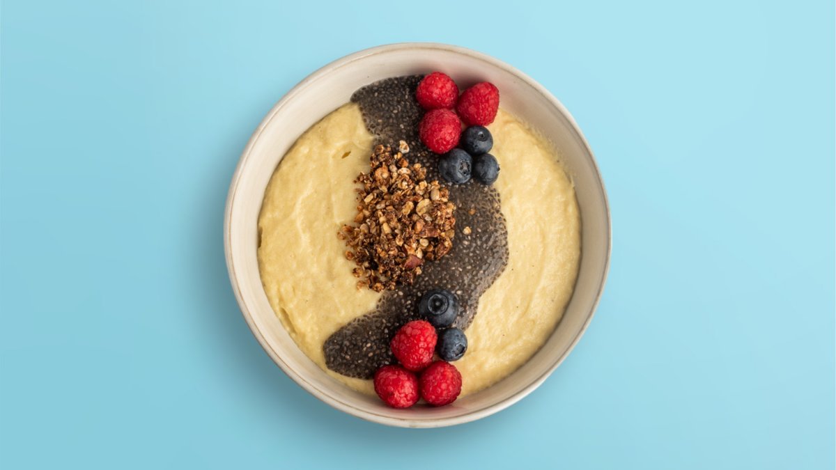 mit Chiasamen, Hanfsamen, Himbeeren, Blaubeeren, Bananen und griechischem Joghurt