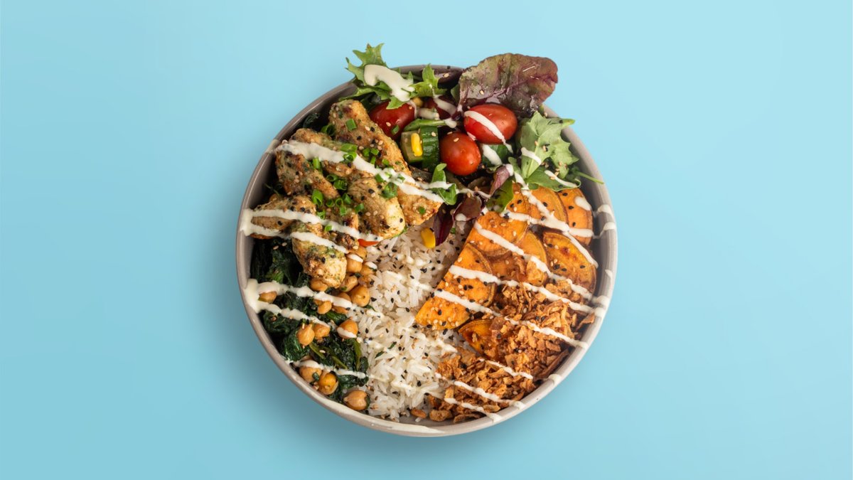Reis, Süßkartoffel, Kichererbsen-Spinat, Hähnchenfilet, Salat, getoppt mit garlic lime mayo