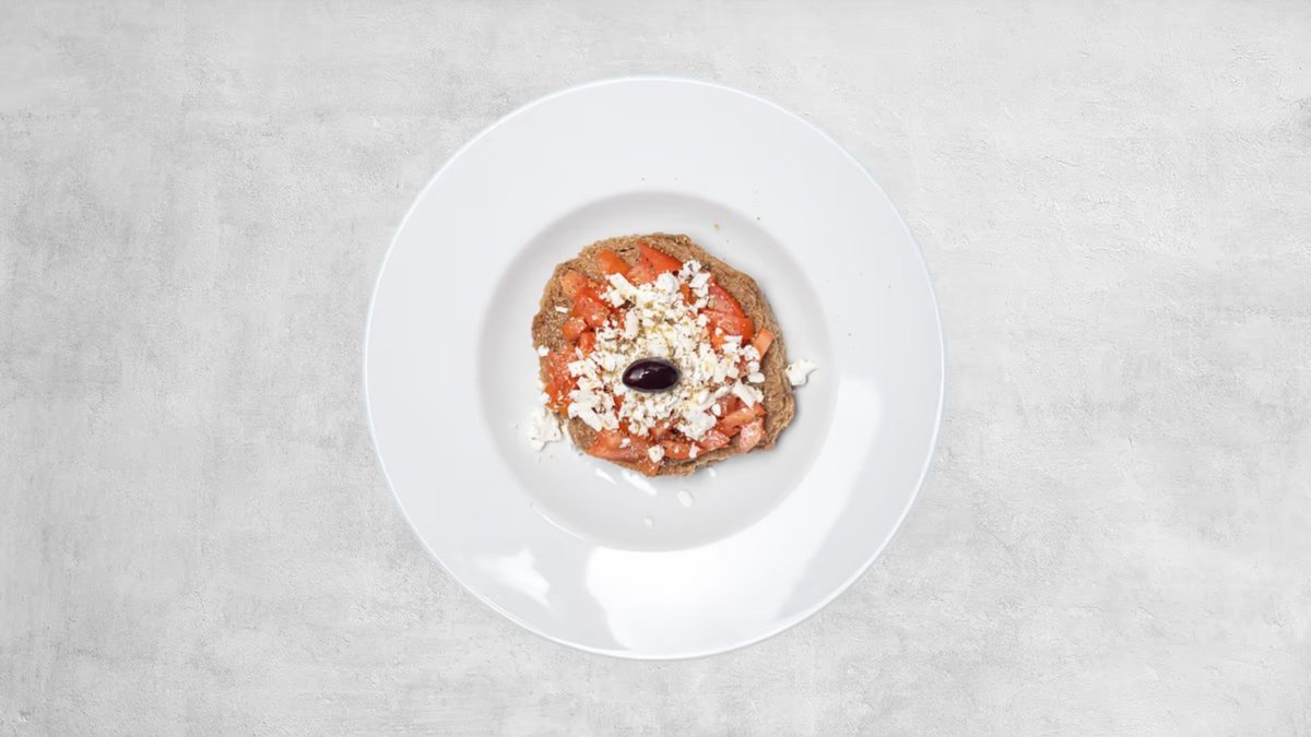dried barley bread from Crete with sheep cheese, tomatoes, olive oil and Cretan oregano