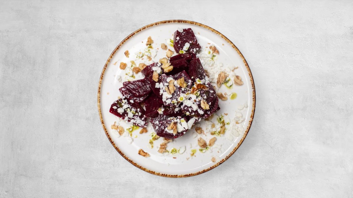 beetroot slices marinated in garlic, olive oil and vinegar, refined with grated sheep cheese and walnuts