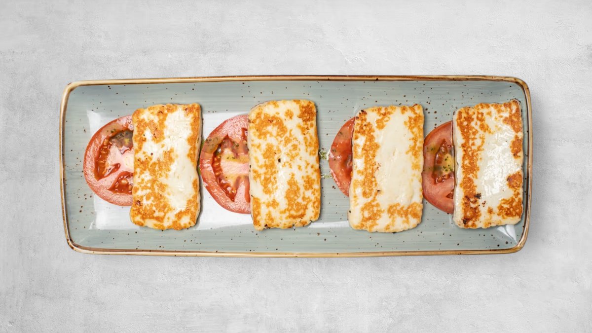 4 pieces Cypriot hard cheese made from cow, sheep and goat milk from the grill on tomato slices