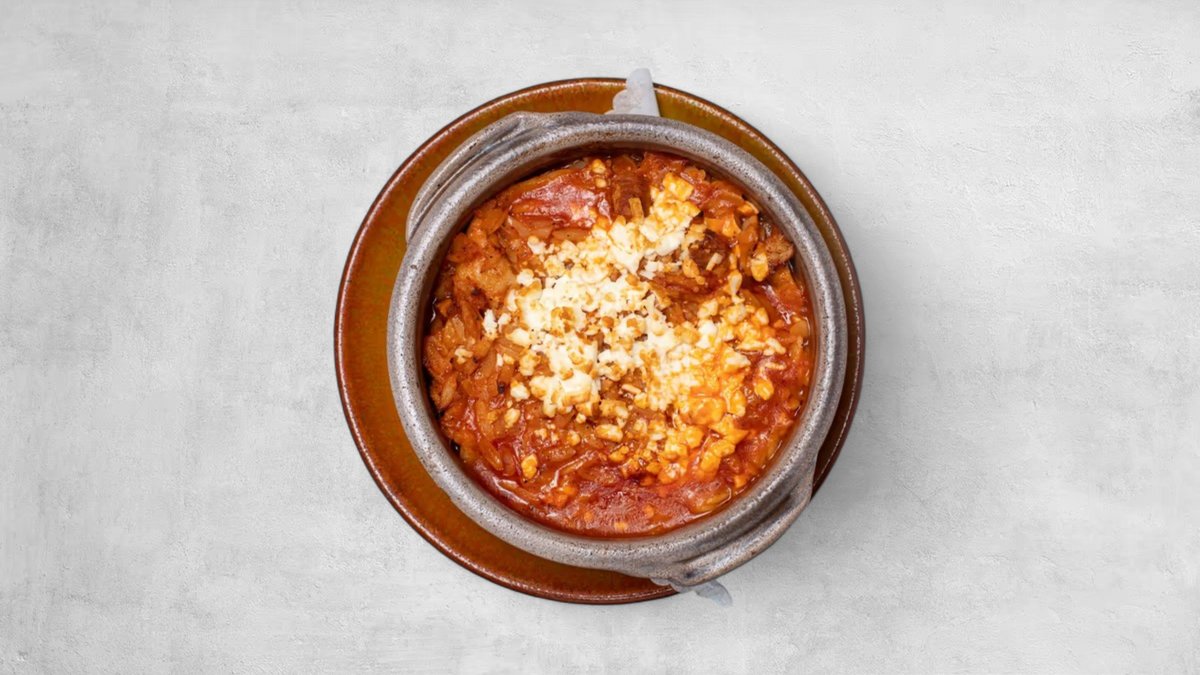 oven-baked sheep cheese with chili peppers, onions, olives and tomatoes