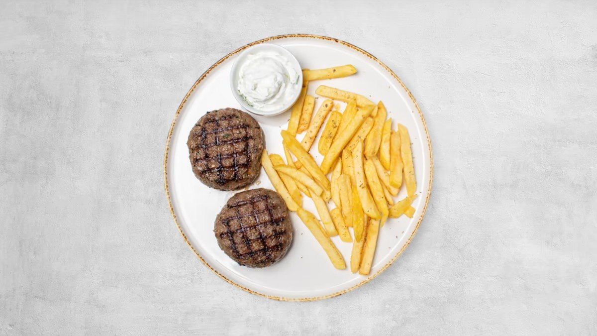 juicy burger with approx. 200 g minced beef, tomato ketchup and fries