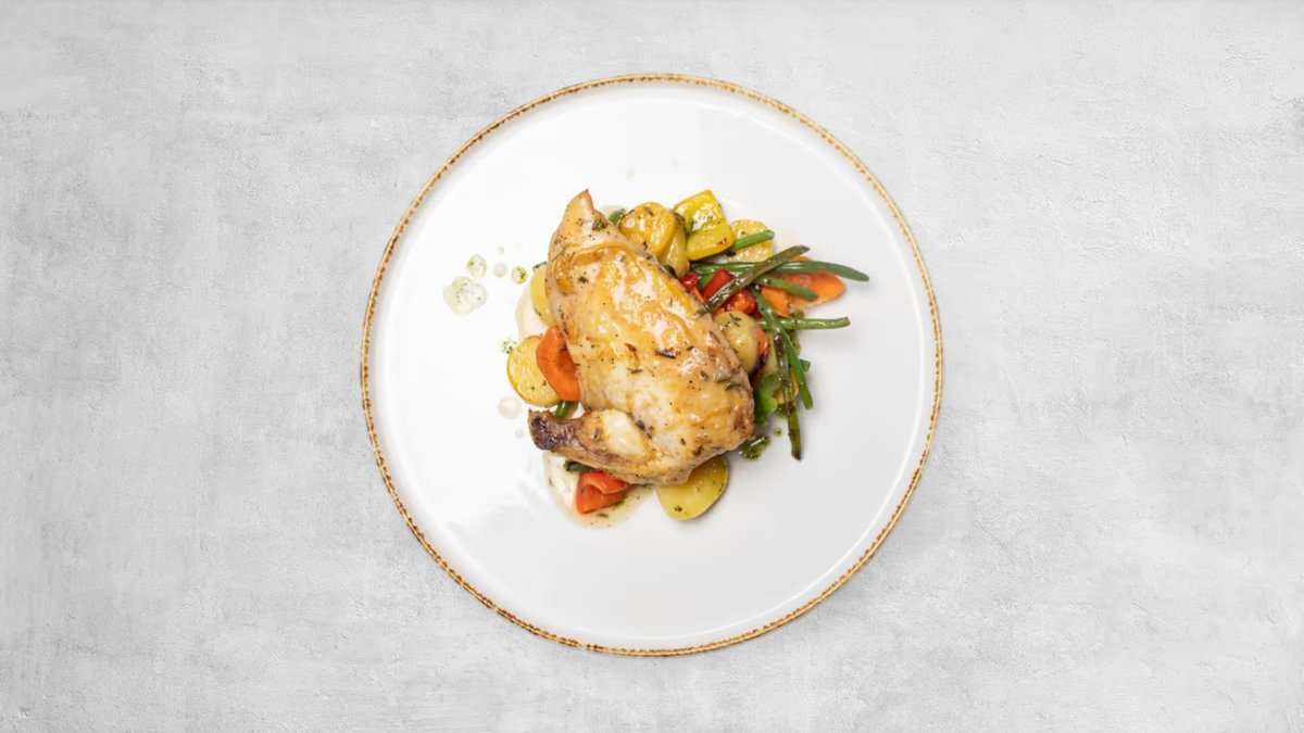 French corn-fed chicken supreme from the grill plate with pan-fried vegetables, lemon and thyme sauce