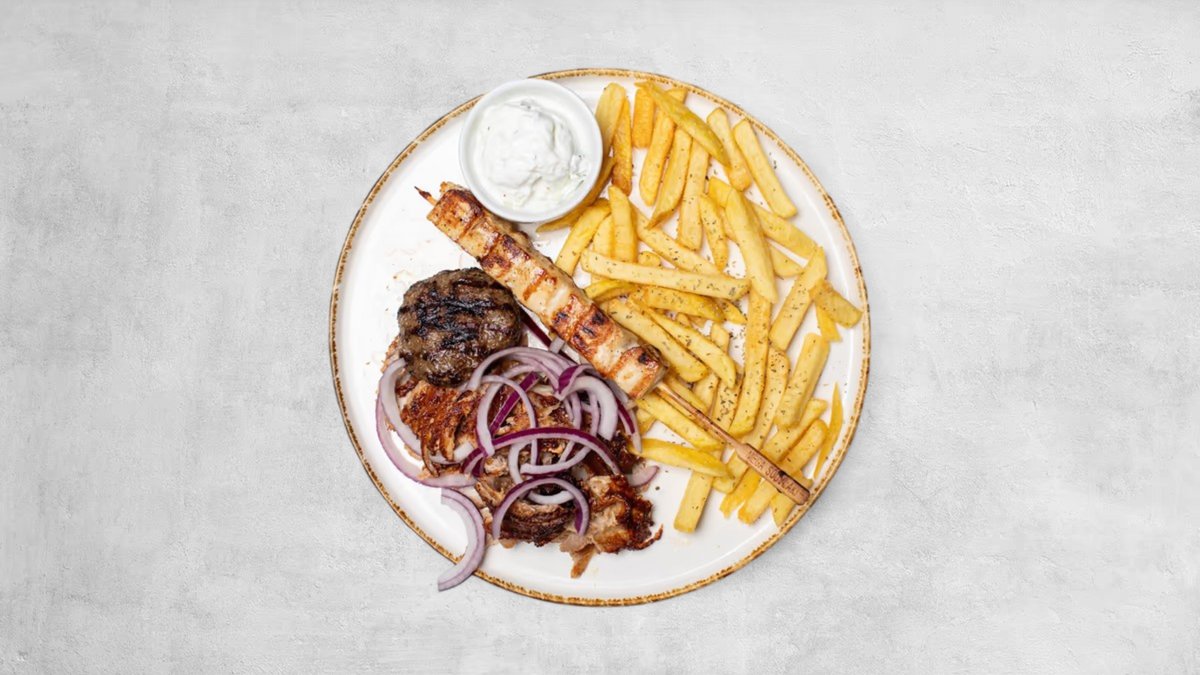 Gyros, 1 chicken skewer, 1 minced beef steak, French fries, tzatzik, side salad (for us, side salad means cucumber, tomatoes, onions and carrots with homemade honey-mustard dressing)