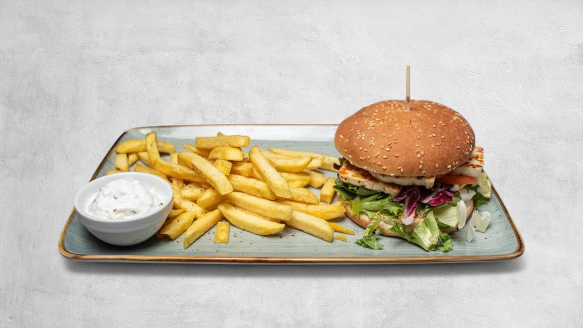 2 beef mince steaks stuffed with feta cheese, served with chips, tzatziki and salad garnish (for us, salad garnish means cucumber, tomatoes, onions and carrots with homemade honey-mustard dressing)
