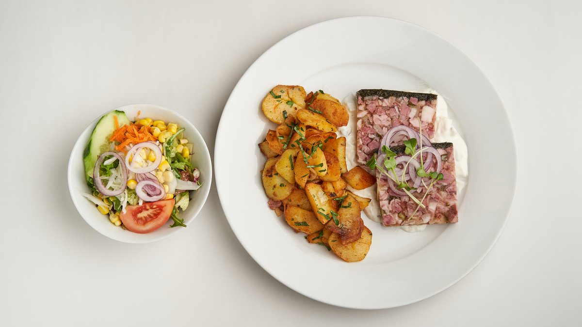 mit Hausfrauensoße, Bratkartoffeln und Beilagensalat