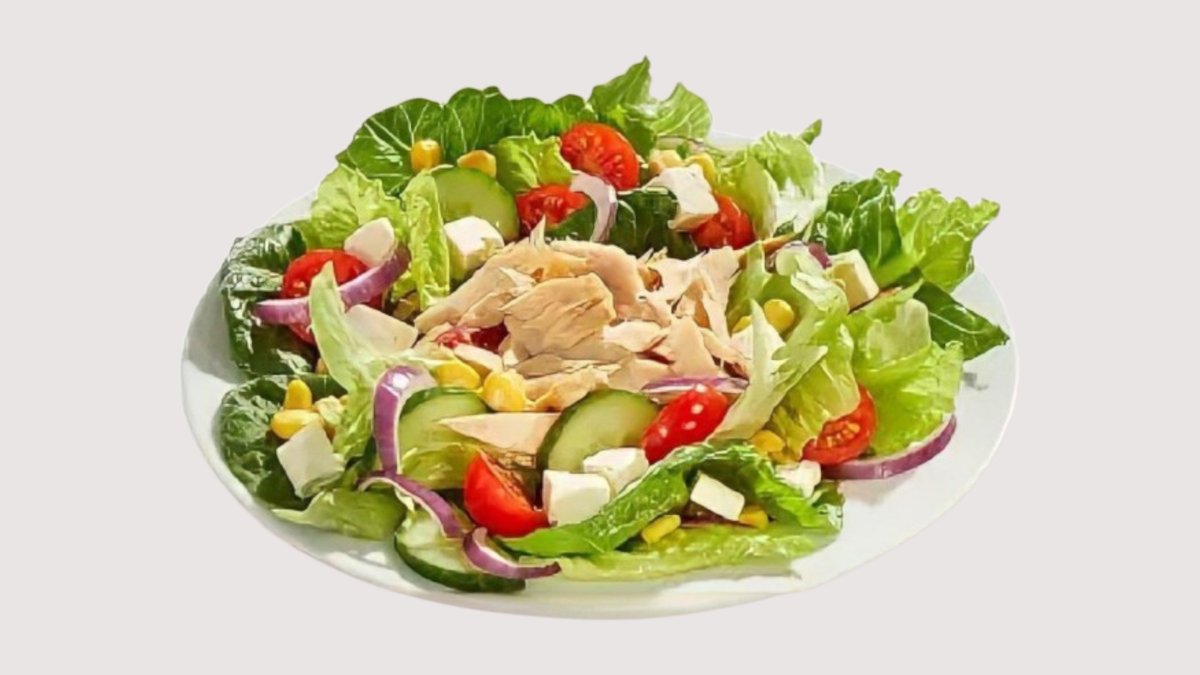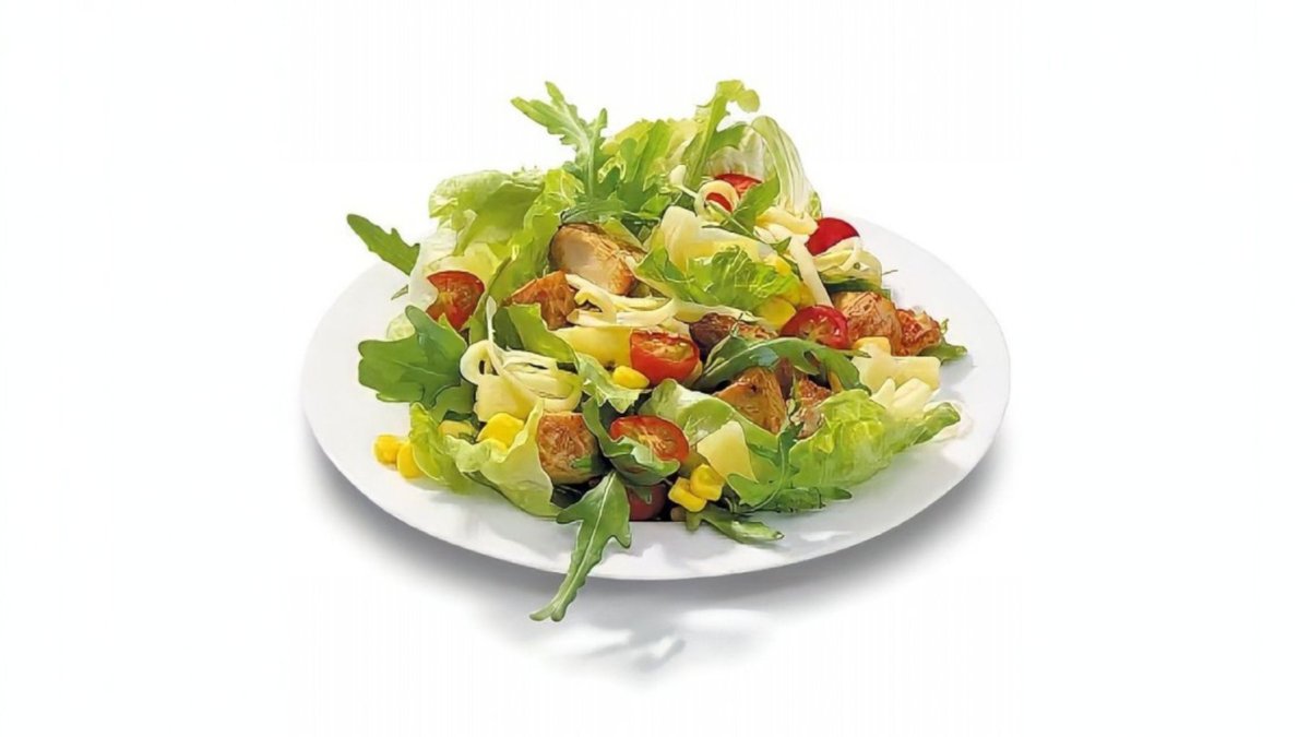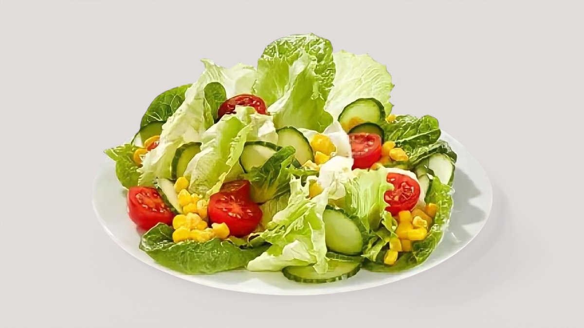 all salads are prepared with cherry tomatoes, cucumbers, bell peppers, corn, olives and onions