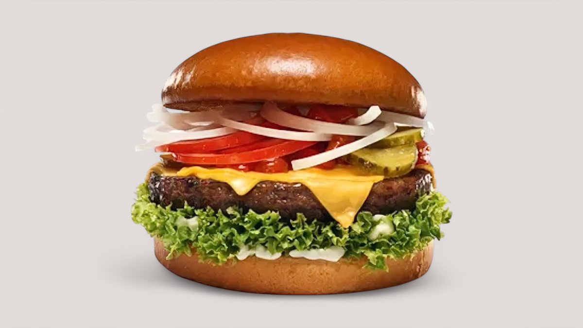 with vegan patty, vegan cheese, onions, pickles, tomatoes, lettuce, vegan sesame bun, ketchup and vegan mayonnaise