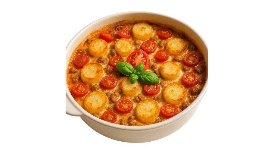 Potato Casserole with Ground Meat, fresh Tomatoes and Cream Sauce