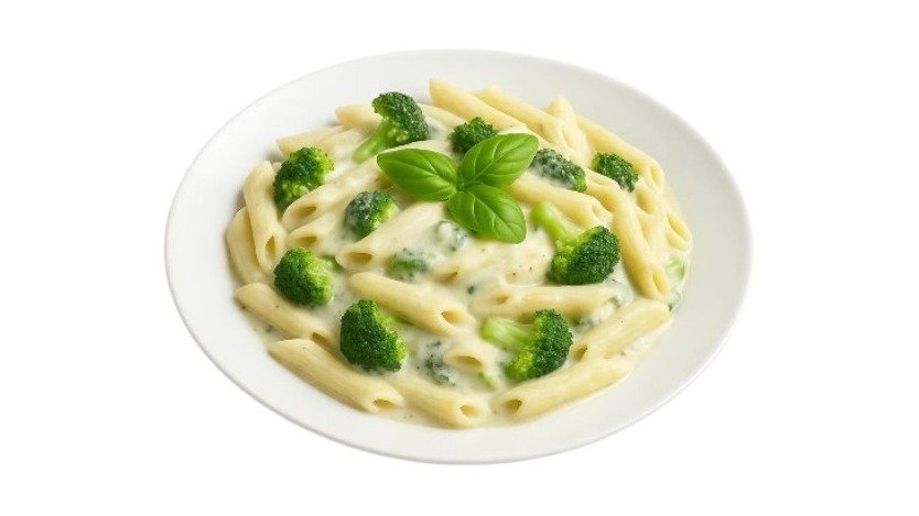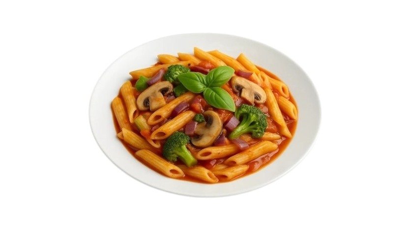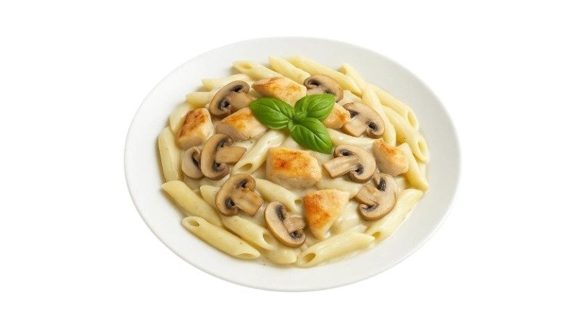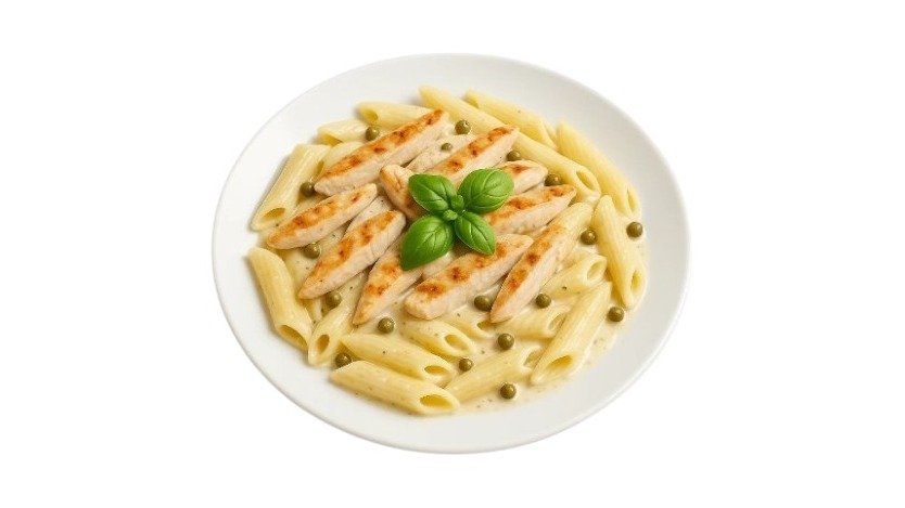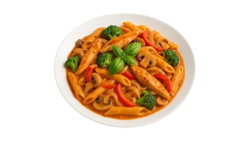 with chicken breast strips, broccoli, onions, bell peppers, champignons and tomato cream sauce