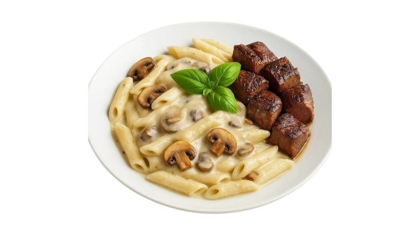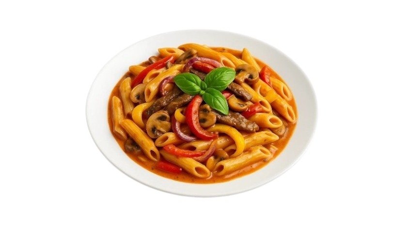 with beef strips, onions, bell peppers, champignons and tomato cream sauce