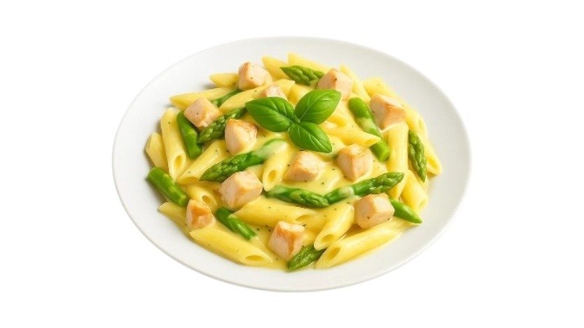 with black tiger prawns, green asparagus, cream sauce and a type of pasta of your choice