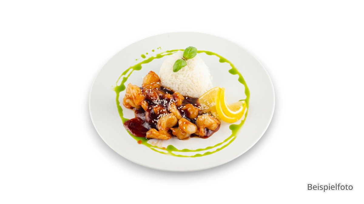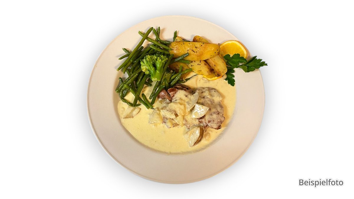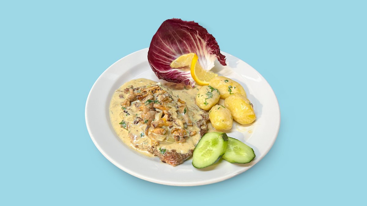 strips of fillet in a creamy champignon sauce and buttered rice