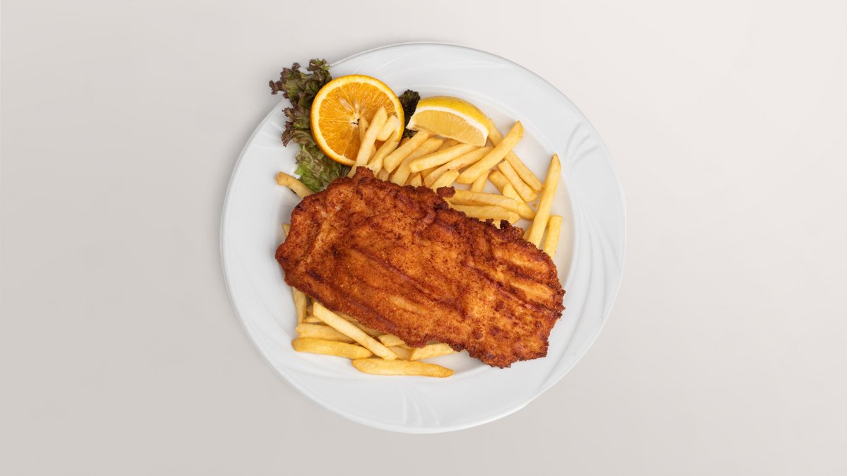 paniert, in Champignon-Sahnesoße, dazu Kroketten