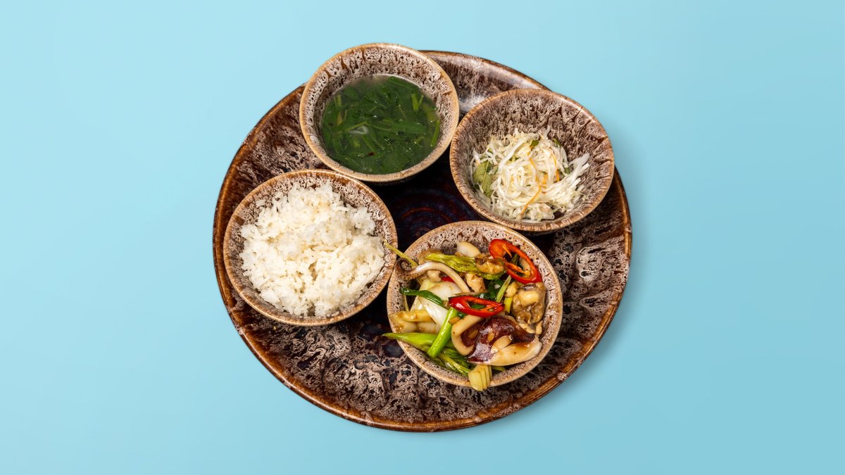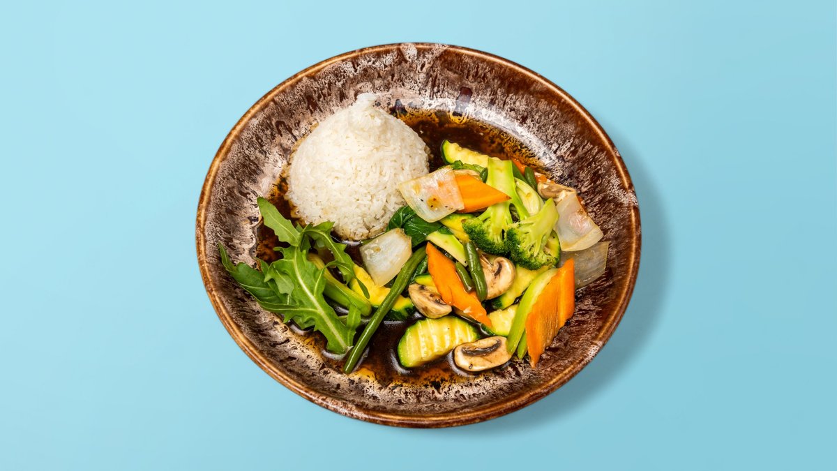 mit saisonalem Gemüse, Champignons, Pak Choi, zartem Duftreis und einer Zutat deiner Wahl