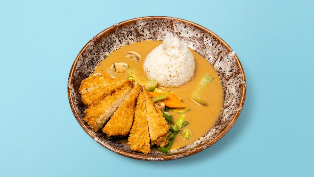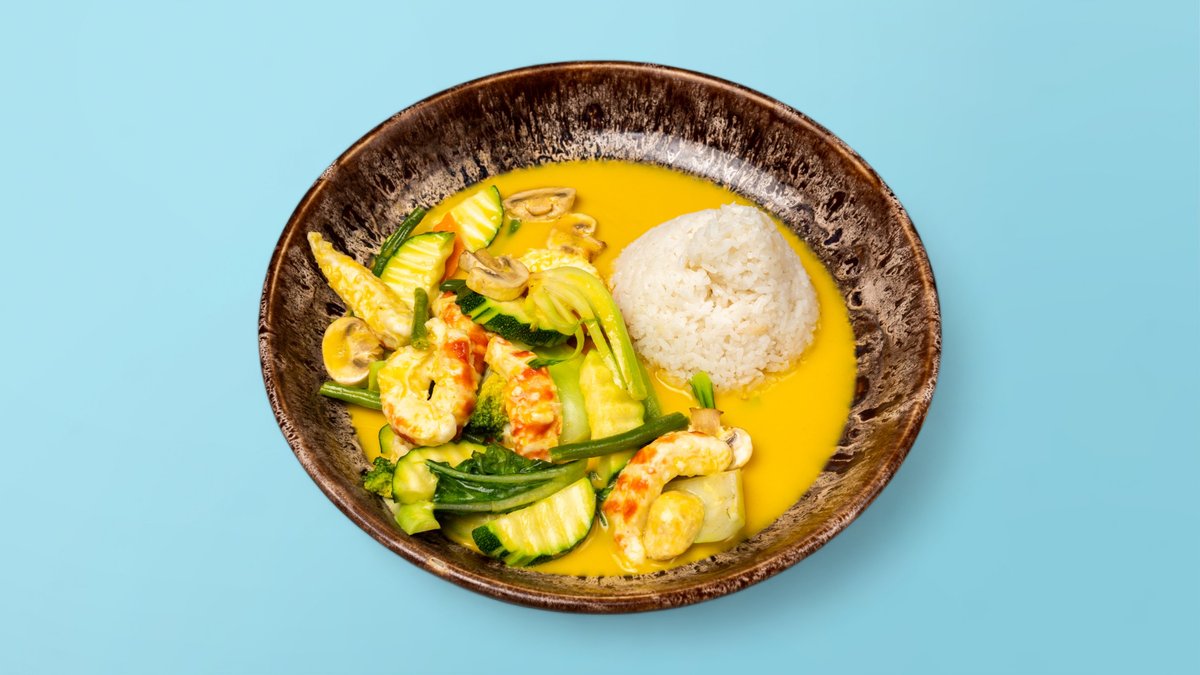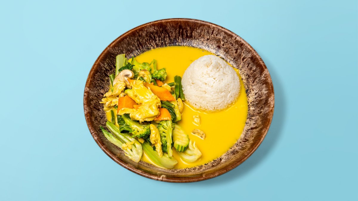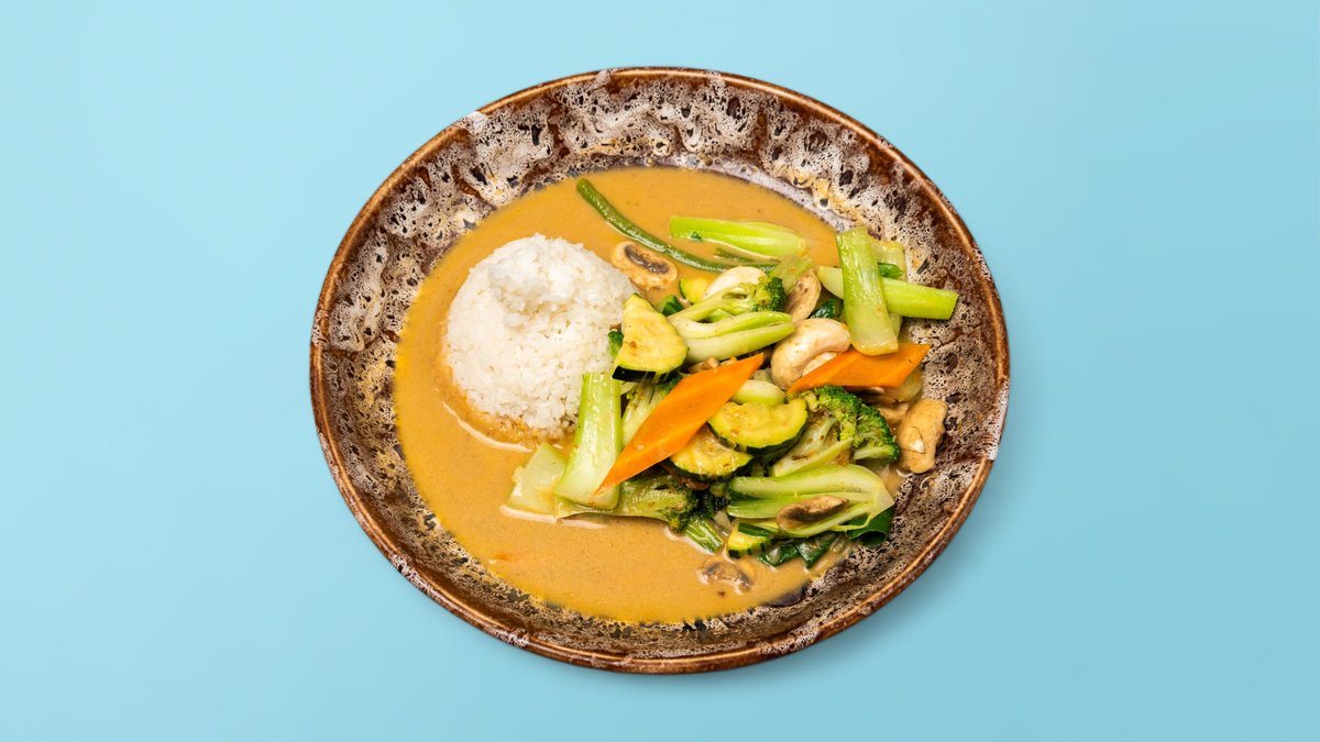 mit cremiger Kokosmilch, saisonalem Gemüse, Champignons, Pak Choi, zartem Duftreis und einer Zutat deiner Wahl