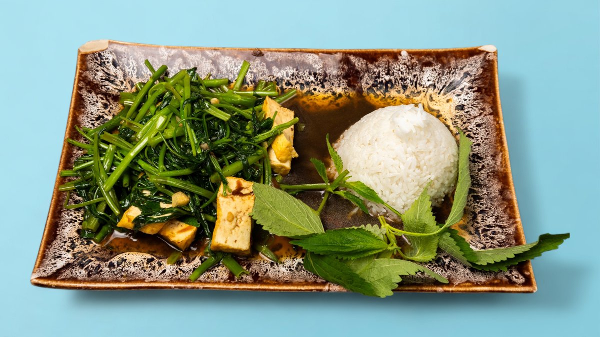 in Knoblauch gebratener Wasserspinat mit Tofu und zartem Duftreis