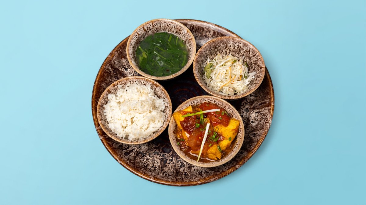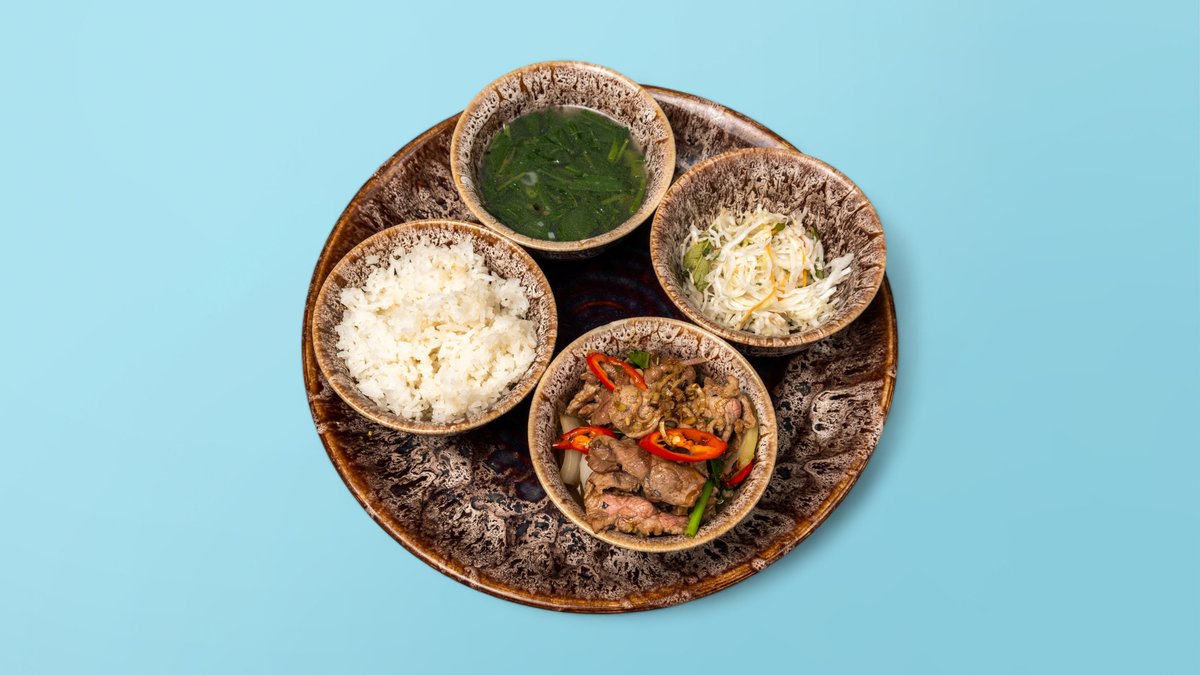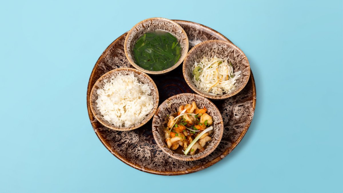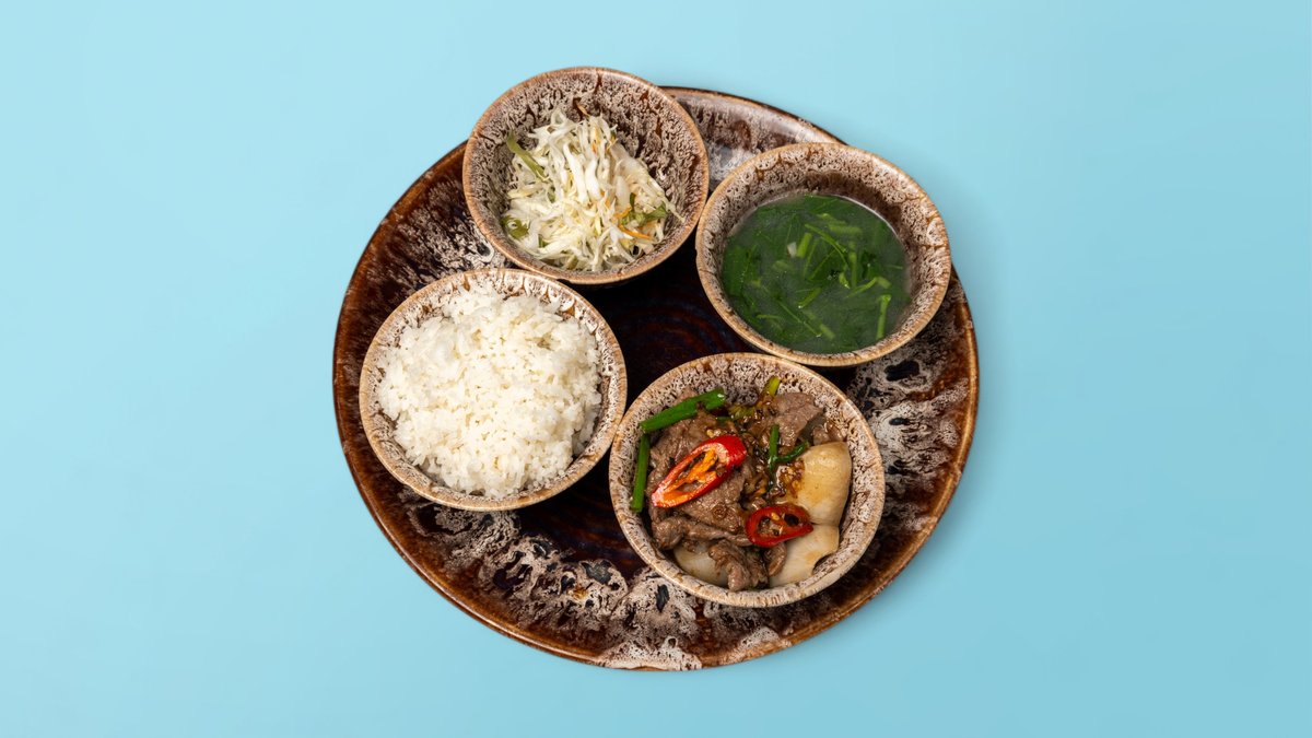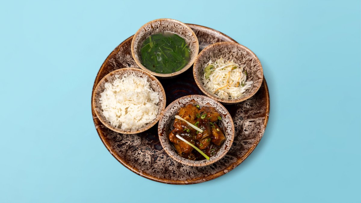 alle Gerichte werden mit gekochtem Reis, Gemüsesuppe und hausgemachtem Sauerkraut serviert