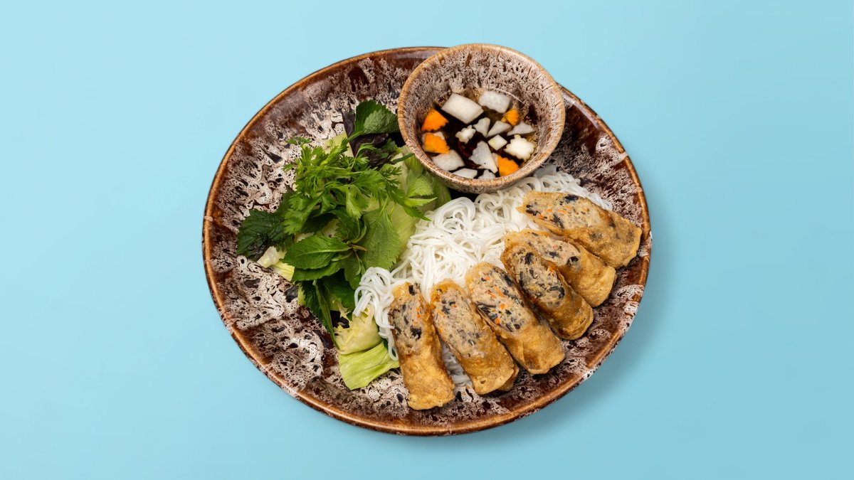 lauwarmes leichtes Reisnudelgericht mit frischem Salat, asiatischen Kräutern, hausgemachten Frühlingsrollen und hausgemachtem Limetten-Dressing