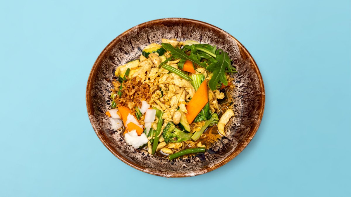 mit saisonalem Gemüse, gerösteten Zwiebeln, asiatischen Kräutern, einer Zutat und einer Nudelsorte deiner Wahl