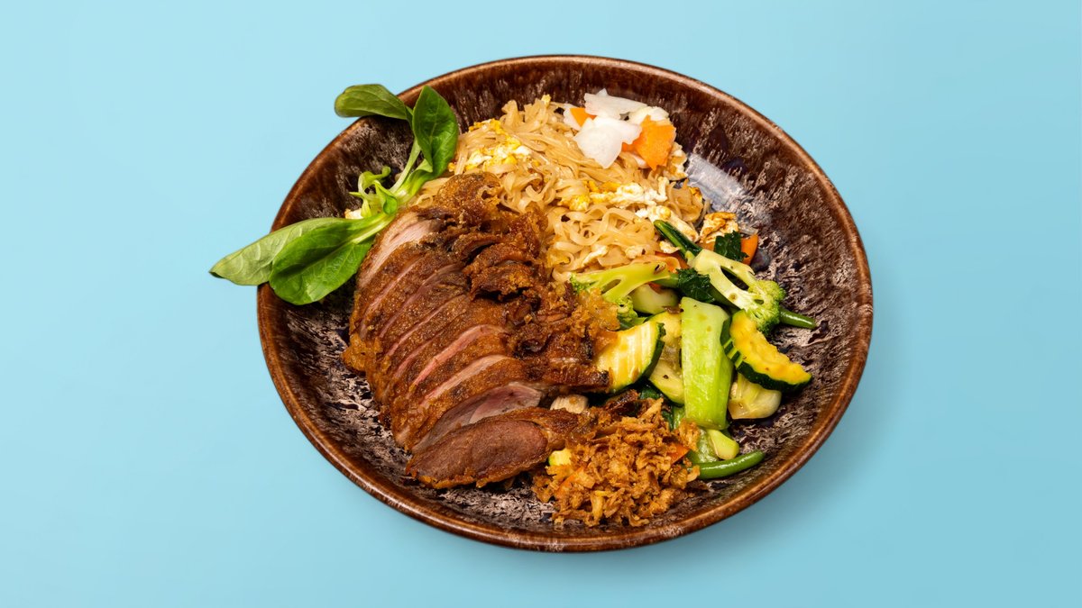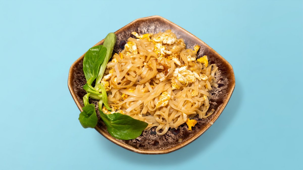gebratene Reisbandnudeln mit saisonalem Gemüse, gerösteten Zwiebeln und einer Zutat deiner Wahl