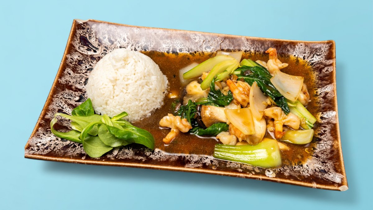 dunkle Pfeffersoße mit gebratenem saisonalem Gemüse, Champignons, Pak Choi, zartem Duftreis und einer Zutat deiner Wahl
