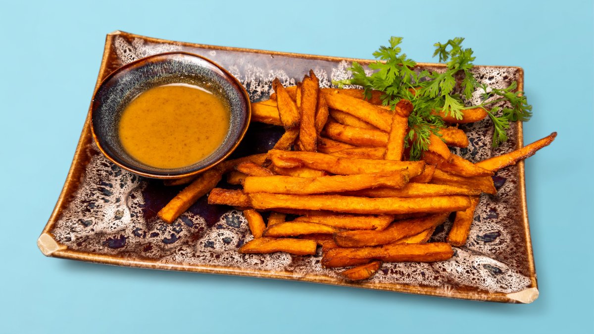 knusprige Süßkartoffel-Pommes mit hausgemachtem Erdnuss-Dip